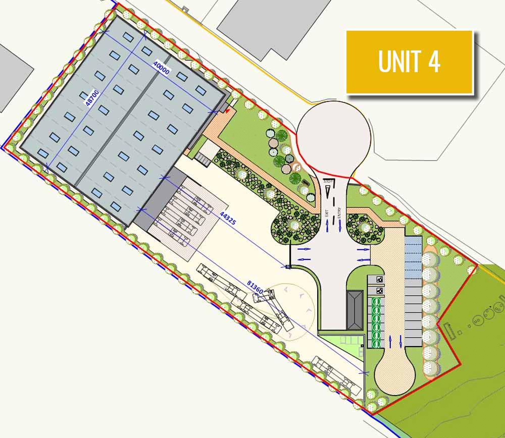 High bay warehouse/ industrial building with a ground floor gross external area of 1,955 SqM (21,044 SqFt) on a site of 0.73 hectares (1.8 acres). Click below to zoom into Building U4